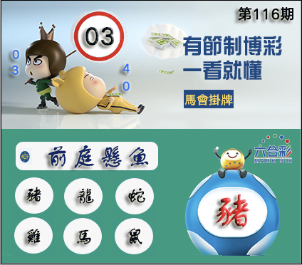 116期正版彩图挂:03 爆:猪 挂牌成语:前庭悬鱼 挂牌出肖:猪龙蛇鸡马鼠