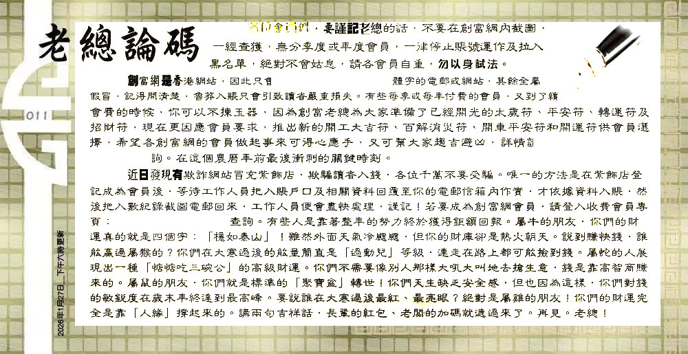 011期:六合皇金句/老总论码/萧公子/林大师/五行夺码/老总信箱截图